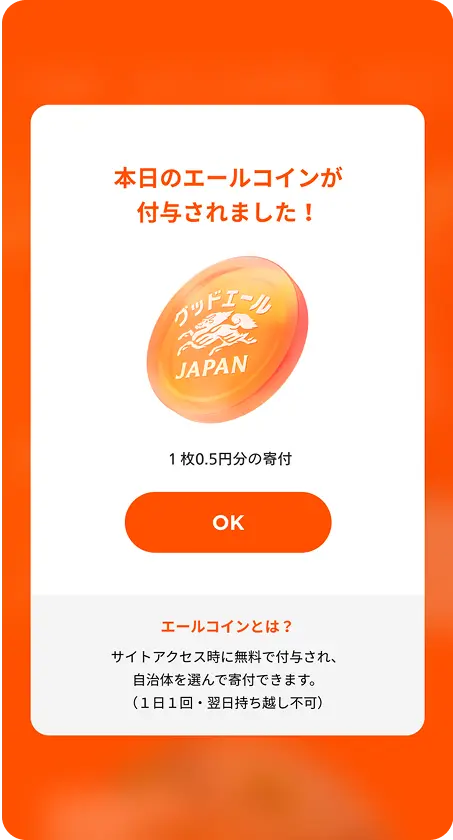 「グッドエールJAPANの参加証明書」はサイト内で1日1回もらえるエールコイン1枚を使用し寄付した場合のみ発行されます。